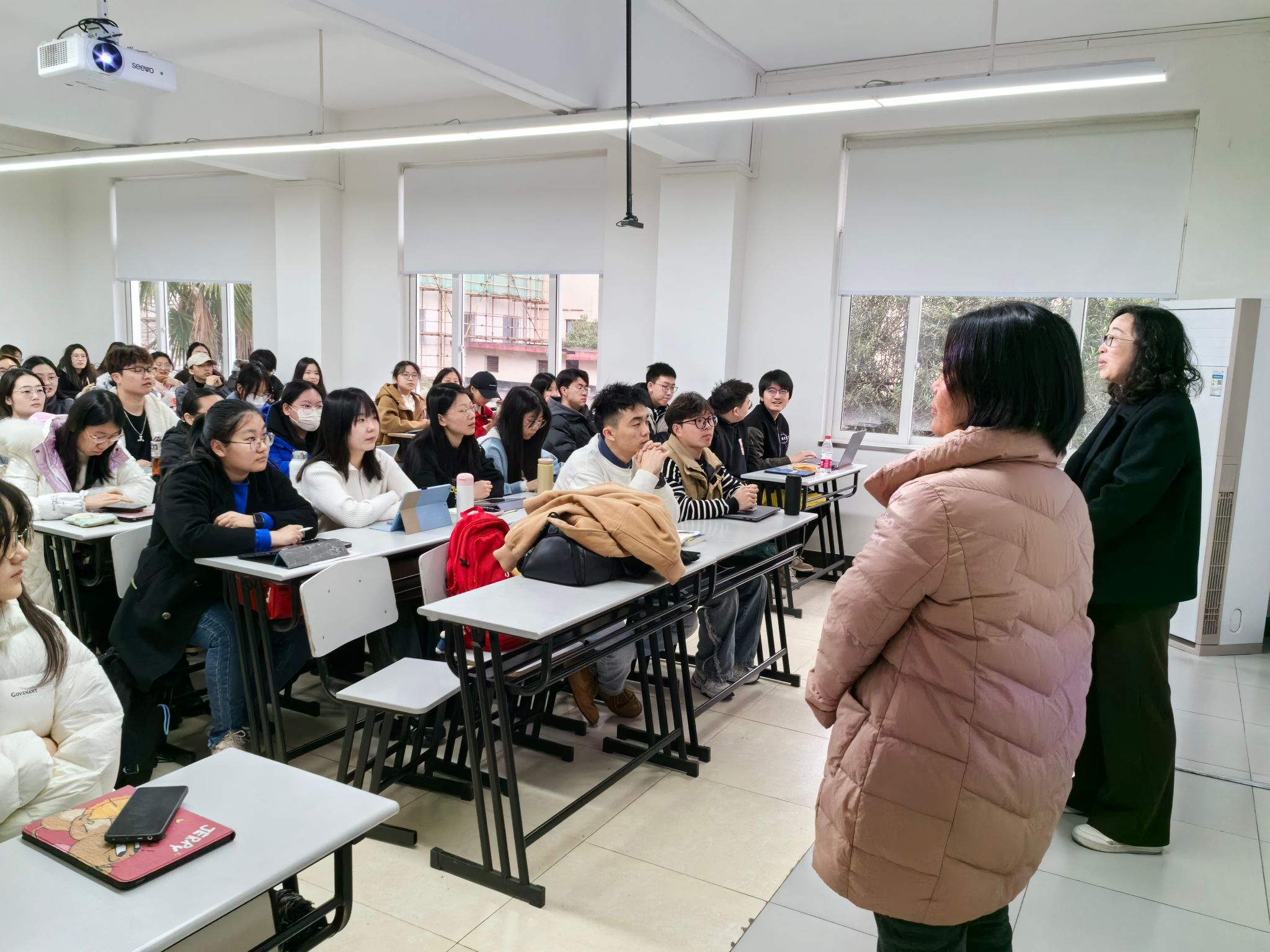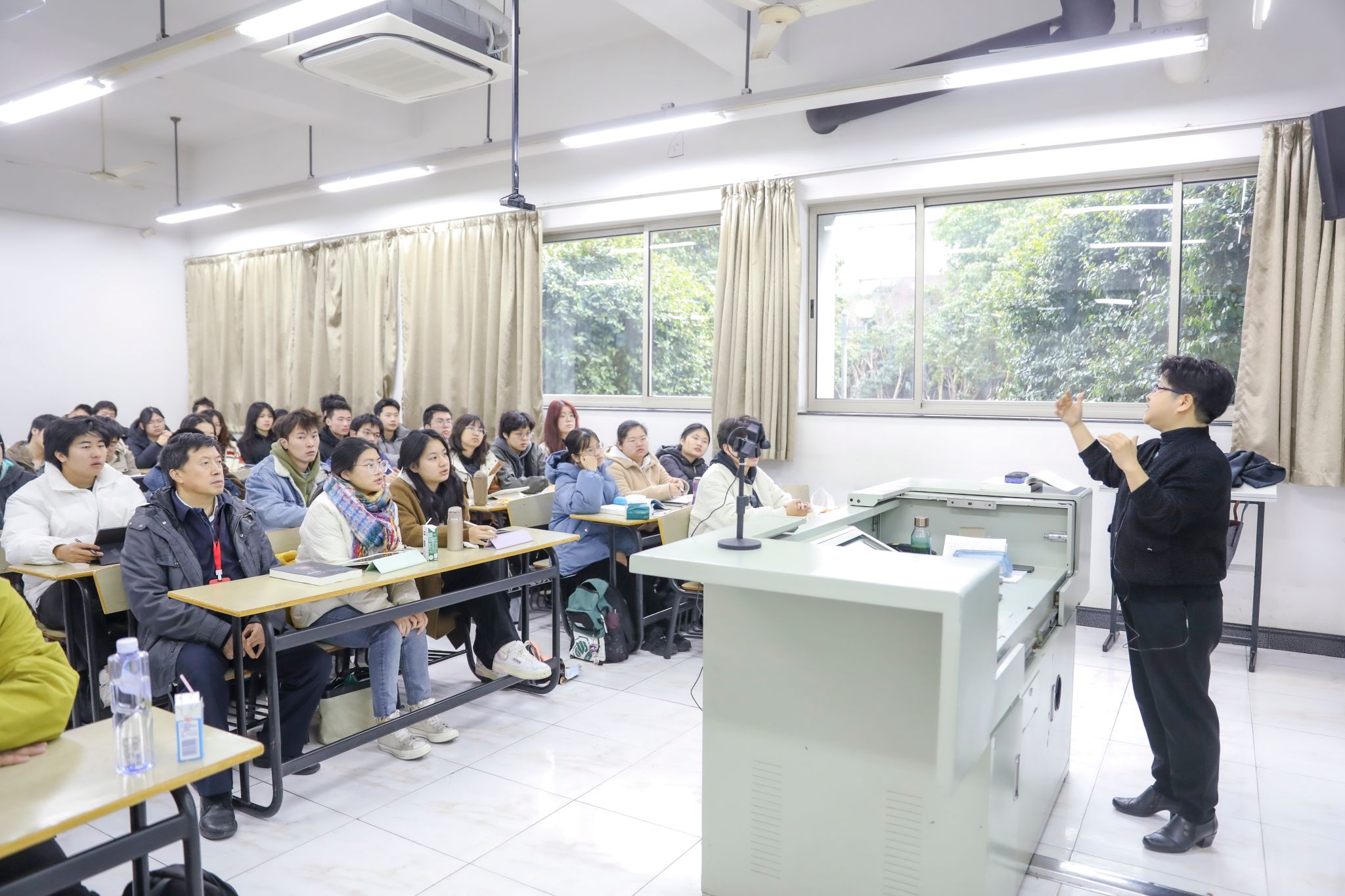在延长校区,教务部、研究生院相关领导和老师联合后勤保障部一早来到四教实地查看教学环境、课堂上课情况等。巡课组分别走进“学术综合英语”“数字营销传播实务”及“剪辑”课堂进行听课。国产亚洲精品美女久久久上海电影学院、上海美术学院、新闻传播学院相关负责同志及教学管理人员一同进行了巡课。