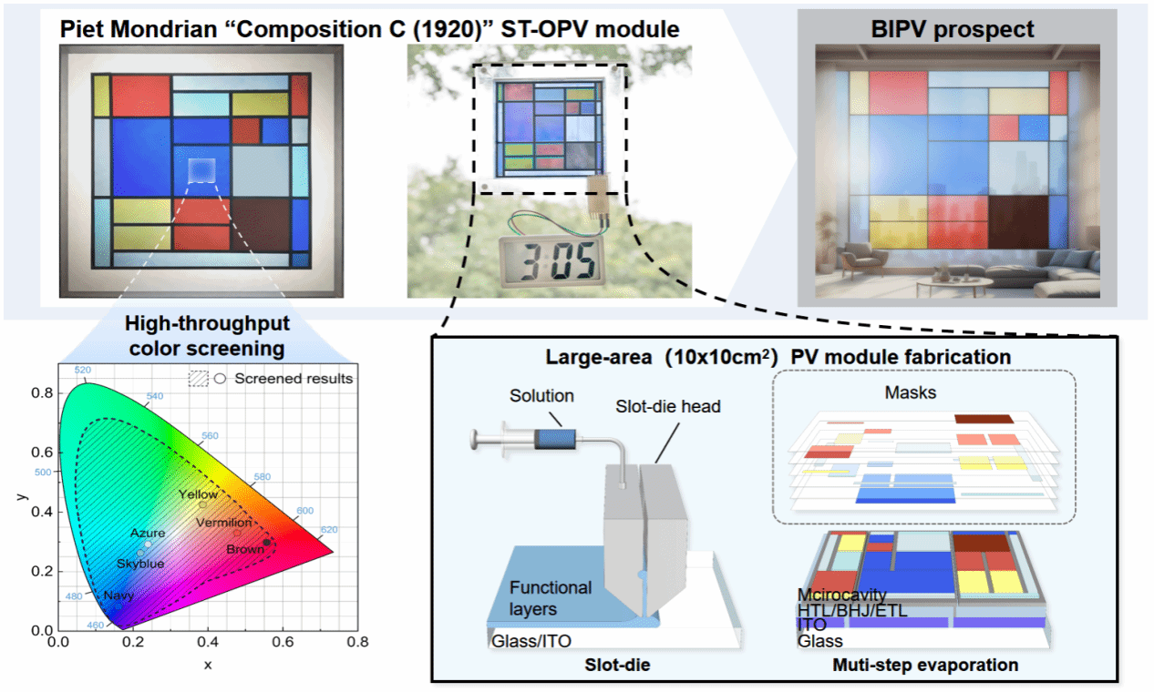本工作创新性地采用彩色ST-OPV光伏组件复现艺术作品,展示了融合科技创新与美学展示的未来光伏建筑应用前景。首先,实现了基于Fabry-Pérot光学谐振腔彩色ST-OPV器件的可控制备,借助高通量光学设计系统考察谐振腔的材料选择和几何尺寸与器件光电性能和色彩之间的关联机制,在红、绿、蓝色域中精准筛选并获得兼具高效率和高透过率的彩色ST-OPV。随后,开发了基于狭缝涂布和多步蒸镀技术的大面积彩色ST-OPV组件制备工艺,以此为基础成功复现了抽象派大师蒙德里安的一副经典作品《构图C(1920)》并应用于光伏玻璃,为推动光伏技术在BIPV中的多功能应用发展提供了一个新的思路。
