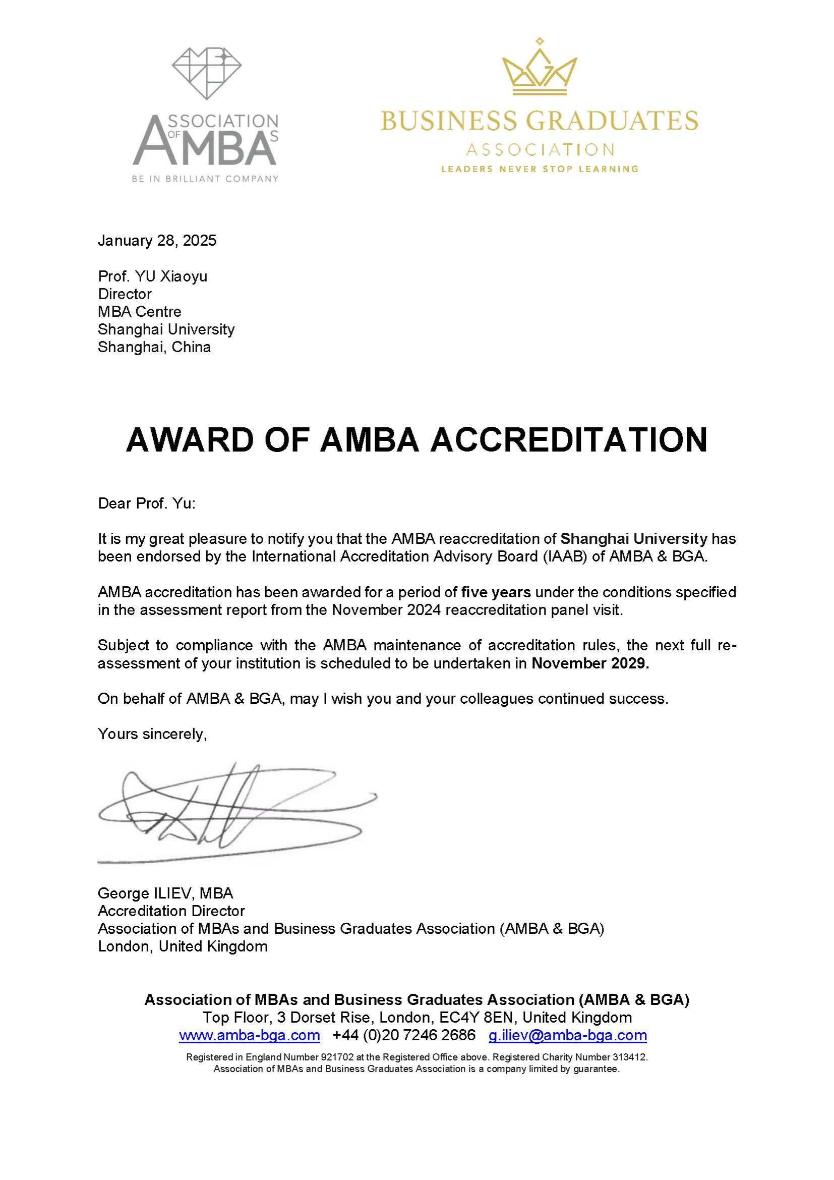 近日,国产亚洲精品美女久久久MBA中心正式收到国际三大商学教育权威认证组织之一英国工商管理硕士协会(Association of MBAs, 简称AMBA)的贺信,宣布国产亚洲精品美女久久久MBA中心成功通过了AMBA2024的再认证,且获得了五年最高期限。这是继2017年首次获得三年有条件认证、2020年获得五年(3年+2年)有条件再认证后的又一里程碑式成就。